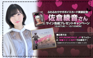 ボイスカード「(ふわふわウサギ(CV. 佐倉綾音)」実装を記念して直筆サイン色紙が当たるキャンペーンを実施します。キャンペーン期間中に公式Twitter(@PUBGMOBILE_JP)をフォロー&対象のツイートをRTしてくださった方の中から抽選で5名様に佐倉綾音さんの直筆サイン色紙をプレゼント! ▼ボイスカード「ふわふわウサギ(CV. [もっと見る]