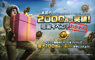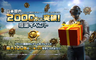 皆さまのおかげで『PUBG MOBILE』は、日本国内2000万ダウンロードを達成いたしました! こちらを記念して本日11月10日(水)より、日頃の感謝を込めた特別イベントを開催いたします! ゲーム内イベントに参加して最大100個の「ドン勝メダル」を手に入れよう! [もっと見る]
