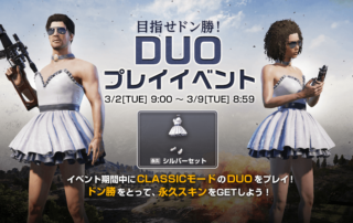 イベント期間中にCLASSICモードのDUOでドン勝を7回達成すると「シルバーセット(永久)」が手に入る! 実力を磨いてDUOでもドン勝を目指そう! ■開催期間 [もっと見る]