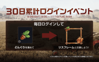 イベント期間中にログインして、イベントアイテム「どんぐり」を手に入れよう! 「どんぐり」30個と交換で「リスフレーム」を獲得できます! <開催イベント> [もっと見る]