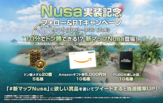 新マップ「Nusa」の実装を記念して、公式Twitter(@PUBGMOBILE_JP)にてTwitterキャンペーンを実施いたします。 Nusaでドン勝して「QUOカード2,000円分」、「PUBGゴム製フライパン」をGETしよう! たくさんのご応募お待ちしております。 [もっと見る]