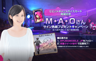ボイスカード「ビビットキャット(cv. M・A・O)」実装を記念して直筆サイン色紙が当たるキャンペーンを実施します。キャンペーン期間中に公式Twitter(@PUBGMOBILE_JP)をフォロー&対象のツイートをRTしてくださった方の中から抽選で4名様にM・A・Oさんの直筆サイン色紙をプレゼント! ▼ボイスカー「ビビットキャット(cv. [もっと見る]