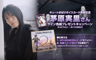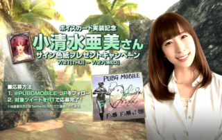 ボイスカード「小清水亜美A」が『PUBG MOBILE』に新登場!これを記念して「直筆サイン色紙」が当たるキャンペーンを実施します。 キャンペーン期間中に公式Twitter(@PUBGMOBILE_JP)をフォロー&対象のツイートをRTしてくださった方の中から抽選で5名様に小清水亜美さんの直筆サイン色紙をプレゼント! [もっと見る]
