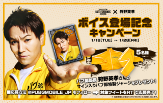 パブ部部長 狩野英孝さんのボイス登場を記念して「狩野英孝さんの直筆サインパブ部特製ジャージ」が当たるキャンペーンを実施します。キャンペーン期間中に公式Twitter(@PUBGMOBILE_JP)をフォロー&対象ツイートをRTしてくださった方の中から抽選で5名様に賞品をプレゼント! [もっと見る]