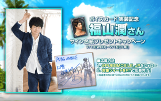 ボイスカード「福山潤A」が『PUBG MOBILE』に新登場!これを記念して「直筆サイン色紙」が当たるキャンペーンを実施します。 キャンペーン期間中に公式Twitter(@PUBGMOBILE_JP)をフォロー&対象のツイートをRTしてくださった方の中から抽選で5名様に福山潤さんの直筆サイン色紙をプレゼント! [もっと見る]