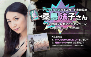 ボイスカード「ツギハギうさぎ(cv.桑島 法子)」実装を記念して「直筆サイン色紙」が当たるキャンペーンを実施します。 キャンペーン期間中に公式Twitter(@PUBGMOBILE_JP)をフォロー&対象のツイートをRTしてくださった方の中から抽選で5名様に桑島 法子さんの直筆サイン色紙をプレゼント! [もっと見る]