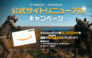 公式サイトリニューアルを記念して、フォロー&RTキャンペーンを実施します。キャンペーン期間中に、公式Twitter(@PUBGMOBILE_JP)をフォロー&対象のツイートをRTした方の中から抽選で20名様に「Amazonギフト券5,000円分」をプレゼント! ■賞品内容 ・Amazonギフト券5,000円分(20名様) [もっと見る]