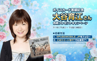 声優「大谷育江さん」のボイスカード実装を記念して「直筆サイン色紙」が当たるキャンペーンを実施します。 キャンペーン期間中に公式Twitter(@PUBGMOBILE_JP)をフォロー&対象のツイートをRTしてくださった方の中から抽選で1名様に「大谷育江さんの直筆サイン色紙」をプレゼント! ■賞品内容 [もっと見る]