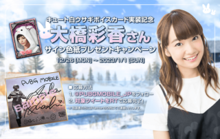 ボイスカード「キュート白ウサギ(CV. 大橋彩香)」実装を記念して直筆サイン色紙が当たるキャンペーンを実施します。キャンペーン期間中に公式Twitter(@PUBGMOBILE_JP)をフォロー&対象のツイートをRTしてくださった方の中から抽選で5名様に大橋彩香さんの直筆サイン色紙をプレゼント! [もっと見る]